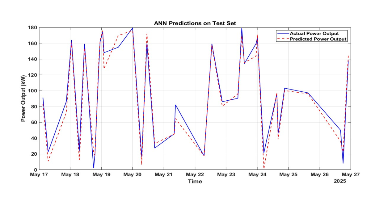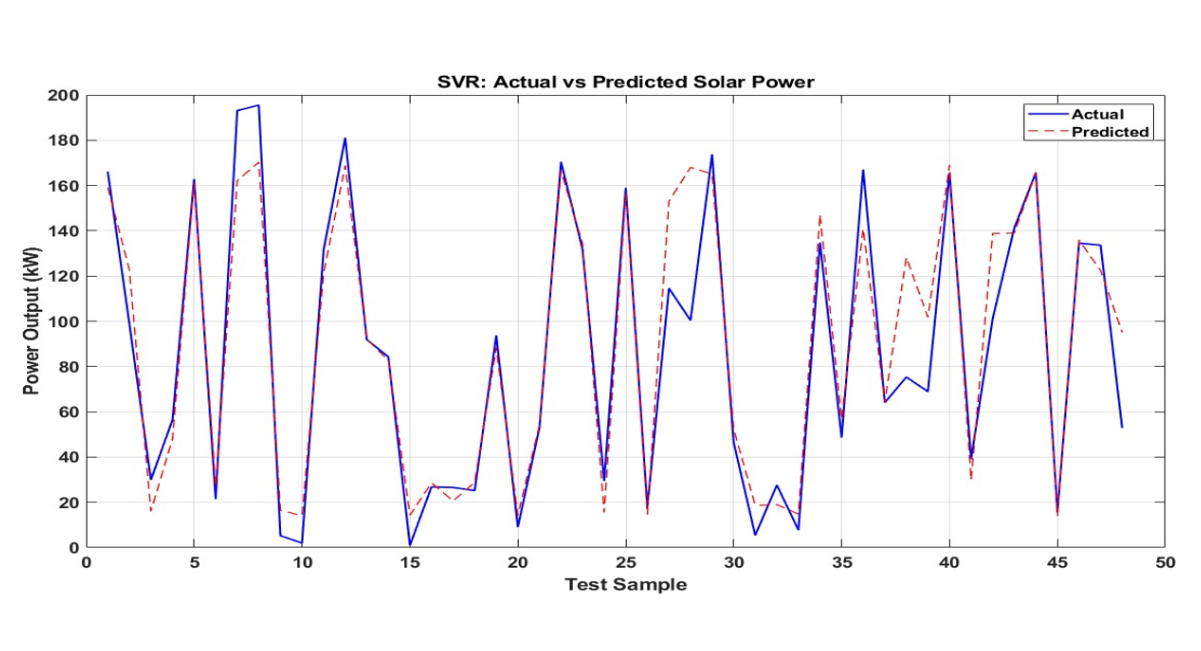 The ANN model proves viable for solar power prediction, evidenced by a Test RMSE of 10.4835 and MAE of 8.3379, suggesting predictions are reasonably accurate despite dataset noise. These metrics RMSE showing error magnitude and MAE the average deviation reflect performance that could improve with ANN architecture optimization, such as tuning hyperparameters. The ReLU activation supports efficient training, while the linear output layer suits this regression task. The SVR model predicts solar power output with a test RMSE of 19.4772 kW and MAE of 12.8695 kW, showing reasonable accuracy for solar energy tasks like short-term load forecasting and battery storage optimization. Yet, a gap between cross-validation and test errors suggests overfitting or train-test distribution differences. Adding features (e.g., humidity, cloud cover, time-based variables), expanding the hyperparameter grid, or using automated tuning could improve performance.
