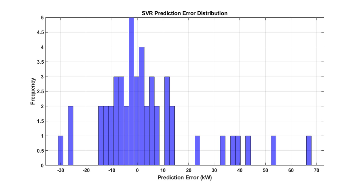 The histogram in Fig. 15 displays prediction errors (predicted minus actual Power Output) in kW across 50 bins, illustrating error frequency and spread. It reveals whether errors are centered near zero, suggesting unbiased predictions, and how tightly clustered they are, indicating prediction precision.