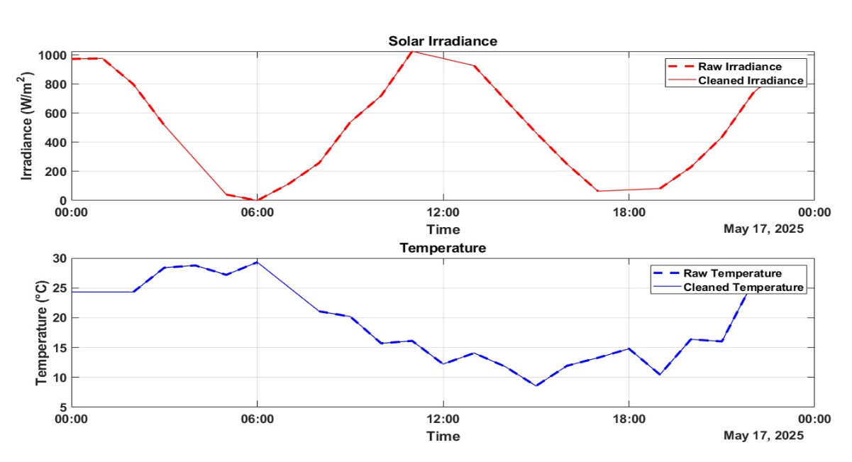 Figure 3 displays raw and cleaned solar irradiance and temperature data in separate subplots, with raw data as dotted lines and cleaned data as solid lines. By addressing missing values, outliers, and noise, the pipeline ensures a robust dataset for training machine learning models, like neural networks or regression models, to predict power output or optimize energy storage [56]. The synthetic dataset enables controlled testing of the data cleaning process, with methods directly applicable to real-world solar energy datasets that often have similar issues like missing values and outliers. The modular, customizable algorithm allows researchers to adjust parameters such as smoothing window size or outlier thresholds to suit specific datasets. The cleaned dataset is saved in a format ready for AI workflows, supporting applications like solar power forecasting and grid optimization.