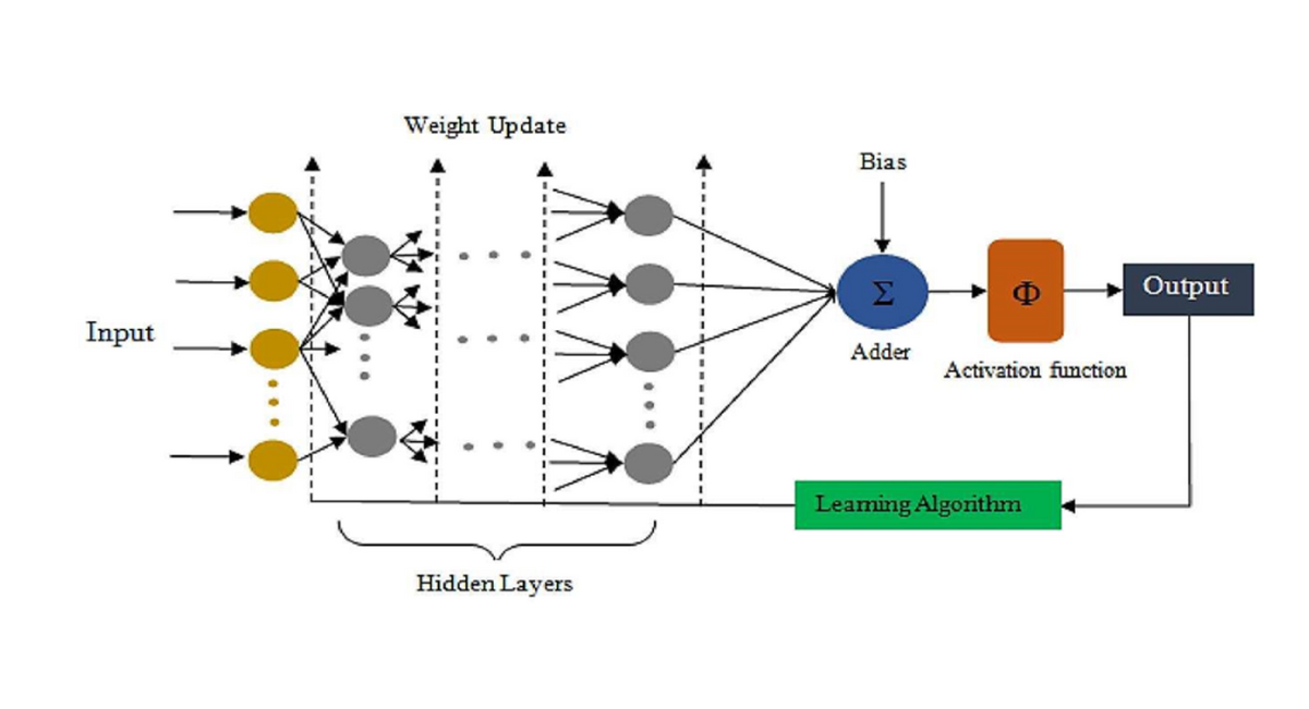 ANNs are feedforward neural networks with multiple hidden layers, designed to model complex, non-linear relationships between inputs (e.g., weather data, system parameters) and outputs (e.g., energy production). Their ability to capture intricate patterns makes them ideal for evaluating performance under controlled conditions and adapting to variable weather scenarios [62].
