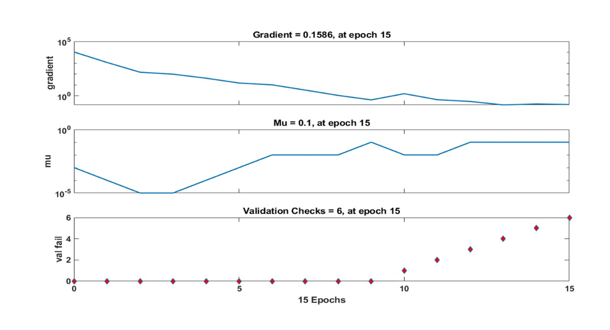 The ANN for predicting solar energy output, central to the study using the DL Toolbox (Fig. 5). The ANN, with two input neurons (solar irradiance, temperature), three hidden layers (100, 50, 25 neurons, ReLU activation), and one output neuron (linear activation), predicts power output. Trained with backpropagation using the Adam optimizer (or Levenberg-Marquardt fallback) for 100 epochs and an approximated batch size of 32, it addresses energy forecasting challenges. The ANN training state of 15 Epoch is shown in Fig. 5.
