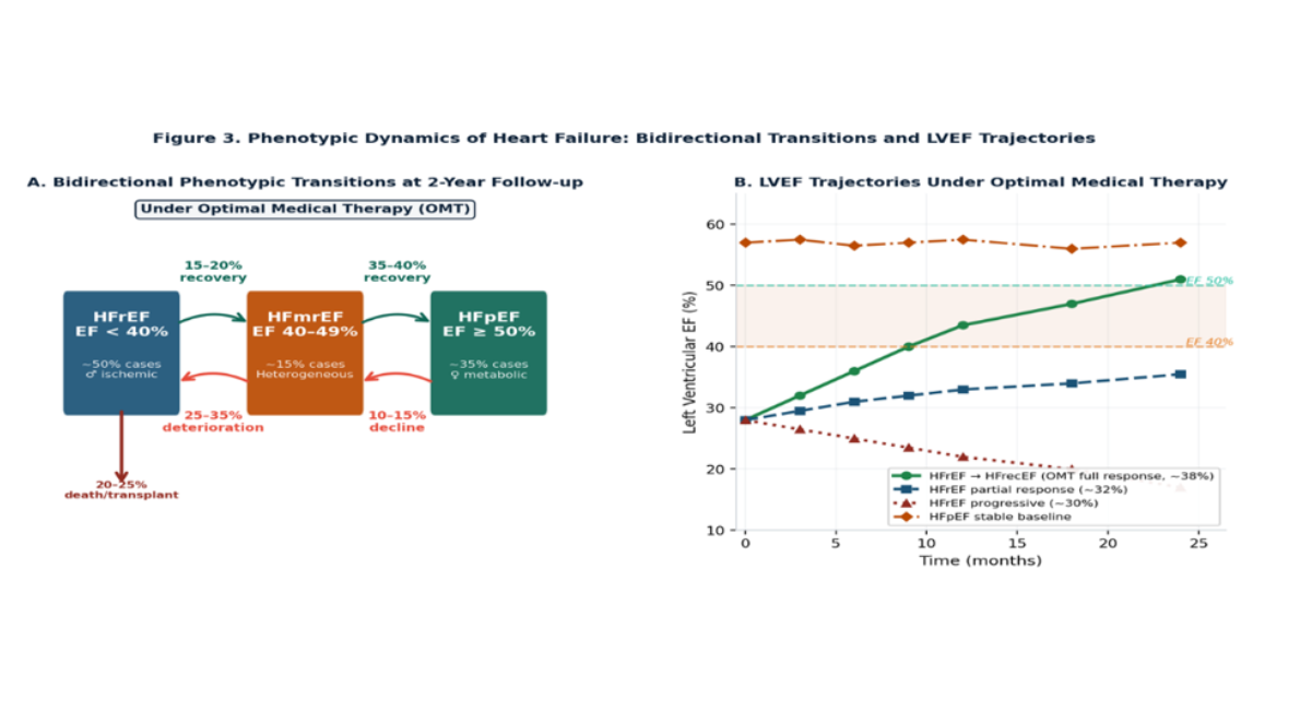 Heart failure (HF) remains among the most consequential syndromes in cardiovascular medicine, affecting an estimated 64 million individuals worldwide and accounting, in developed health systems, for more hospital admissions than any other single diagnosis. The 2021 European Society of Cardiology (ESC) guidelines formalised the tripartite classification of HF by left ventricular ejection fraction (LVEF): HF with reduced EF (HFrEF, LVEF < 40%), HF with mildly reduced EF (HFmrEF, LVEF 40-49%), and HF with preserved EF (HFpEF, LVEF ≥ 50%). This classification has brought conceptual clarity while also revealing that phenotypic categories are not immutable, and that a patient's position within the EF spectrum may shift substantially over months to years depending on the adequacy of therapy, the underlying aetiology, and the systemic comorbidity burden.