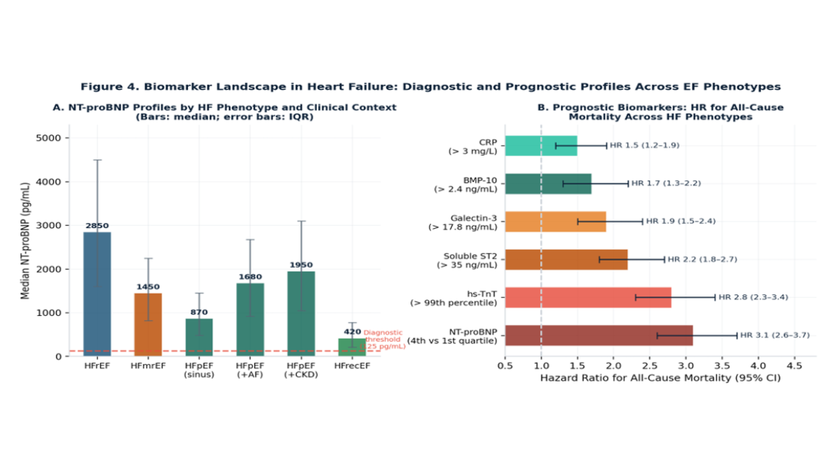 Biomarker assessment in HF serves multiple distinct roles: diagnosis, prognostic stratification, therapeutic monitoring, and phenotypic sub-classification. NT-proBNP retains diagnostic utility across all three EF categories (threshold: 125 pg/mL in non-acute settings), with median values that differ substantially between phenotypes: exceeding 2,500 pg/mL in HFrEF versus 800-1,200 pg/mL in HFpEF with sinus rhythm and preserved renal function [1,4,11].