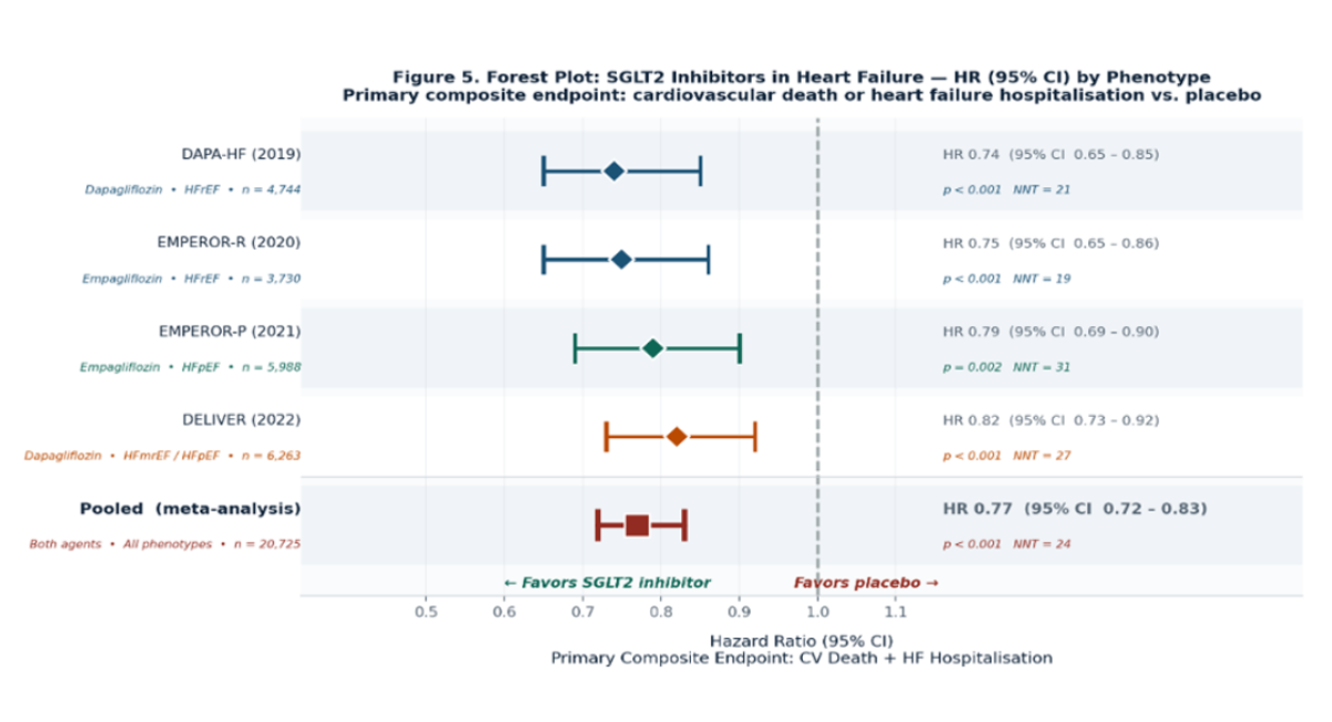 DAPA-HF (2019) enrolled 4,744 HFrEF patients and demonstrated that dapagliflozin 10 mg daily reduced the composite of CV death, HF hospitalisation, or urgent HF visit by 26% (HR 0.74, 95% CI 0.65-0.85), with identical benefit across diabetes status [12]. EMPEROR-R (2020) confirmed these findings with empagliflozin, adding a signal of slowed eGFR decline [13]. EMPEROR-P (2021) and DELIVER (2022) extended efficacy to HFpEF and HFmrEF [14,15].