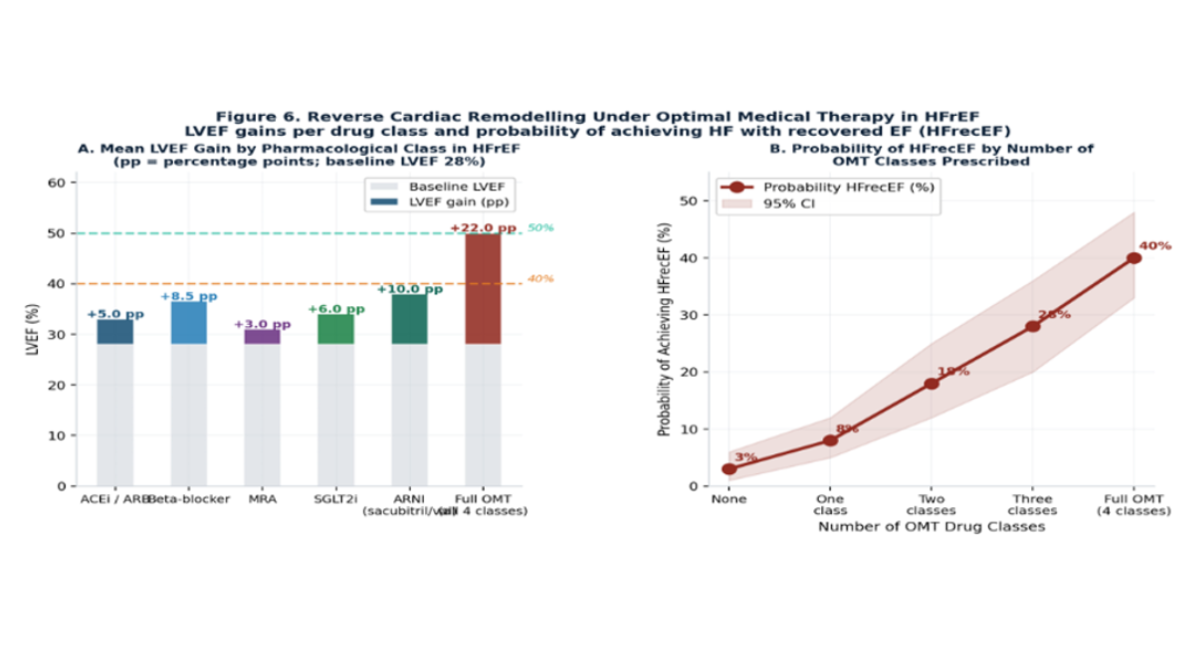 Therapeutic inertia remains deeply persistent: fewer than 25% of HFrEF patients discharged from hospital receive target doses of all guideline-recommended classes [17]. The ARNI sacubitril/valsartan reduced cardiovascular death and HF hospitalisation by 20% relative to enalapril (HR 0.80, 95% CI 0.73-0.87) in PARADIGM-HF [4], with echocardiographic sub-studies confirming greater LVEF recovery and LV volume regression than enalapril alone [8]. Full four-class OMT is associated with a HFrecEF probability of approximately 40%, compared with under 10% for monotherapy.
