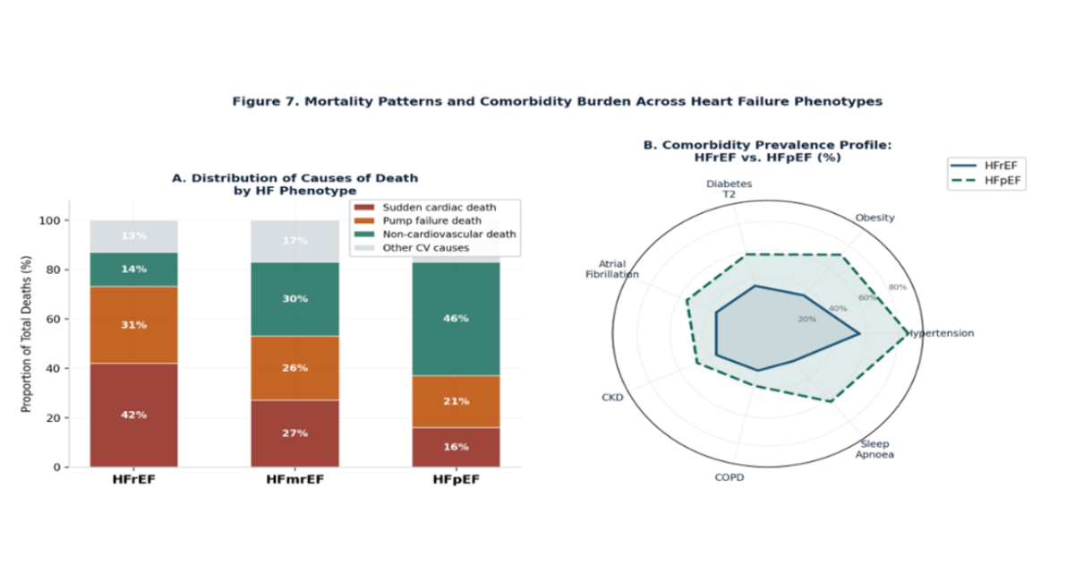 Figure 7: Mortality patterns and comorbidity burden across heart failure phenotypes