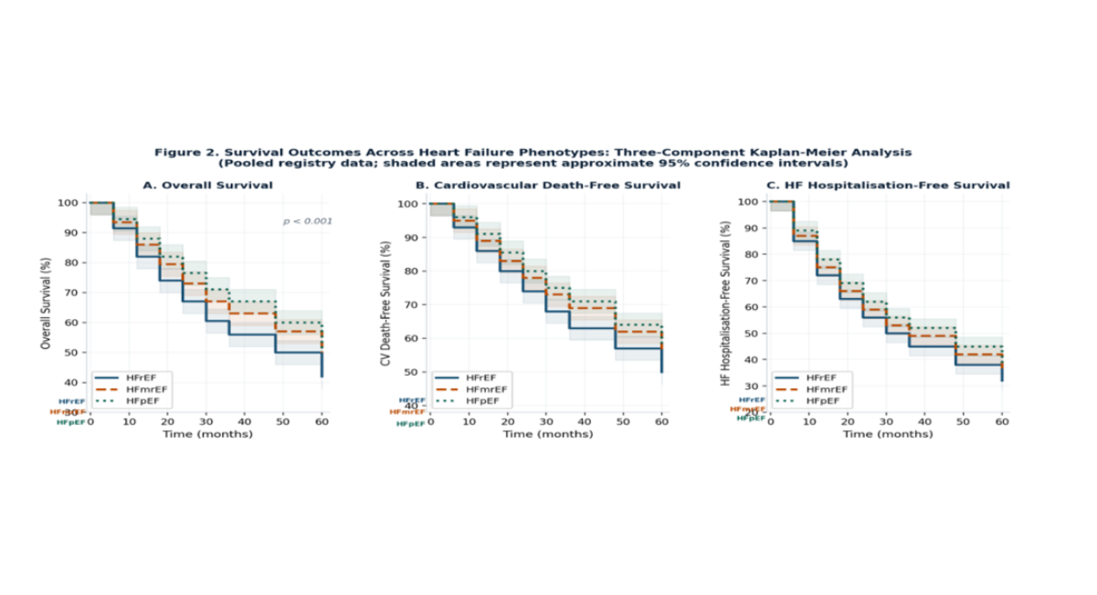 Figure 2: Three-component Kaplan-Meier analysis of survival outcomes across HF phenotypes.