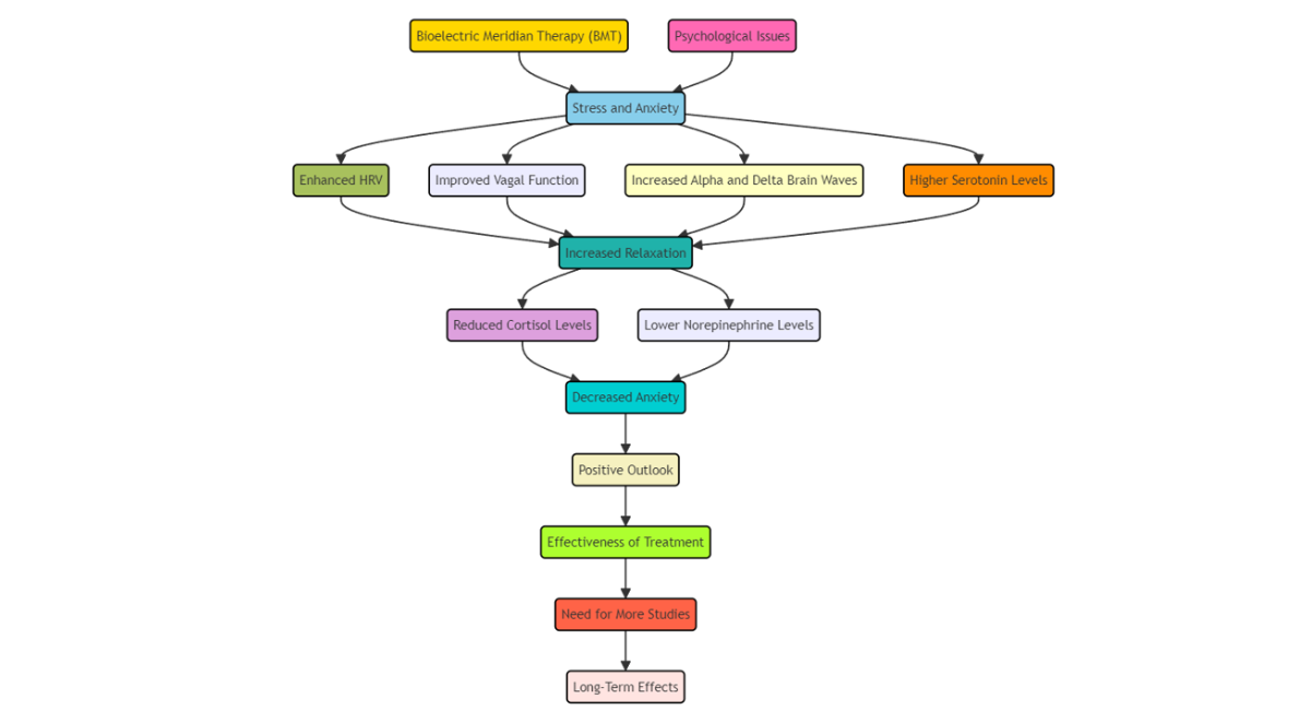 Although BMT has been found to decrease anxiety and stress hormone levels in many studies. The specific question of whether BMT can produce lasting anti-anxiety effects in human clinical trials beyond the treatment periods is still not well established. Although there is a clinical report on the impact of a placebo, utilising randomised sham-controlled trials and considering the results of trials with longer follow-ups [24]. It is also still unknown if BMT offers better outcomes than first-line treatments for anxiety disorders, such as psychotherapy and medications [25]. Current studies indicate that ABMMA-BMT might help manage stress and may be beneficial in addition to usual care for treating various elements of anxiety, like in the recovery from Long COVID [26]. Harnessing electrical stimulation also supports ABMMA-BMT biological insights and therapeutic applications [27]. Recently, a comprehensive mini-review published on the understanding of electrotherapy for pain management, in which there is an introduction to ABMMA-BMT [28]. While following two interesting articles are in the press: 1. Introducing ABMMA bioelectric meridian therapy (BMT): A holistic path to wellness [29]; 2. Bioelectric Meridian Therapy: A promising modality for immune modulation and inflammation management [30].